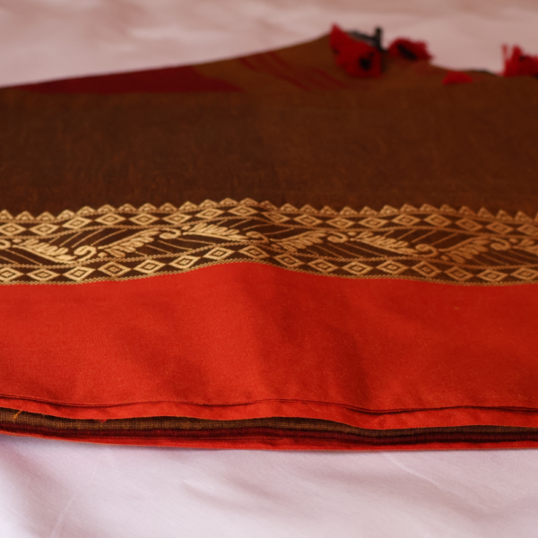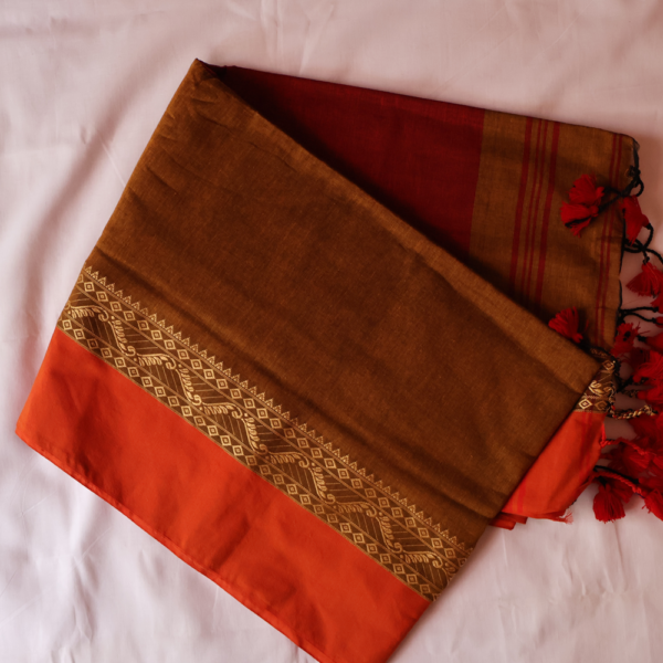 Crafted from 100% pure cotton, this Brown with Orange Saree blends earthy elegance with a vibrant touch. The rich brown base, highlighted with striking orange accents, creates a beautiful contrast that enhances its charm. Its lightweight and breathable fabric ensures comfort, making it ideal for casual outings, office wear, or festive occasions. With a soft texture and graceful drape, this saree is a timeless addition to your wardrobe, perfect for those who appreciate classic beauty with a pop of color.