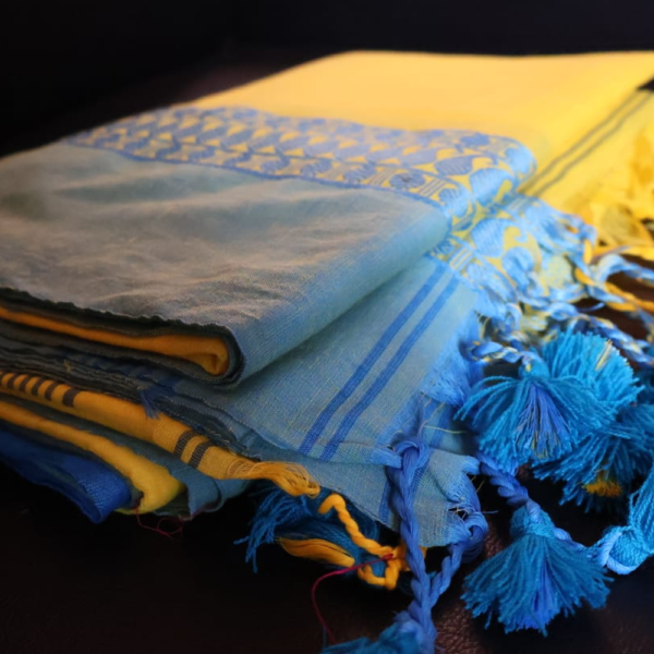 Brighten up your wardrobe with this stunning Pure Cotton Yellow With Blue fabric. Crafted from 100% pure cotton, it features a cheerful yellow base complemented by subtle blue accents that add a refreshing contrast. Ideal for summer wear, this fabric is lightweight, breathable, and gentle on the skin – making it perfect for sarees, suits, kurtas, or even DIY fashion projects. Its vibrant color combination ensures a stylish, traditional look with a modern twist.