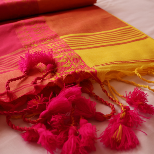 Made from 100% pure cotton, this stunning Yellow with Pink fabric combines elegance with everyday comfort. The cheerful yellow base, complemented by pink accents, adds a lively and refreshing touch to any attire. Its lightweight and breathable texture ensure ease of wear, making it ideal for kurtas, sarees, dresses, and more. Whether for casual outings or festive occasions, this fabric drapes beautifully, offering both style and comfort in every stitch.